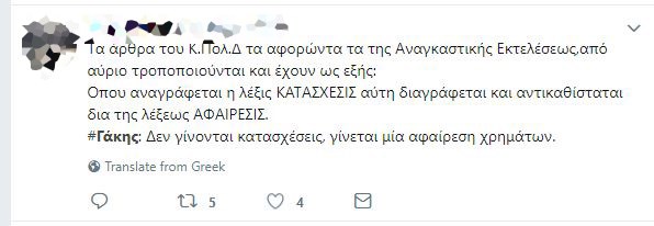 Σάλος έχει προκληθεί στα social media από τη δήλωση του βουλευτή Δωδεκανήσου του ΣΥΡΙΖΑ Δημήτρη Γάκη για τις κατασχέσεις.Όπως δήλωσε ο κ. Γάκης στον ΣΚΑΪ την Τρίτη, δεν υπάρχουν κατασχέσεις αλλά «αφαίρεση χρημάτων από κάποιους λογαριασμούς. δεν είναι κατάσχεση λογαριασμών».«Μην το λέτε έτσι, άλλο είναι κατάσχεση. Κατάσχεση σημαίνει σου παίρνω χρήματα, άλλο κατάσχεση χρημάτων, άλλο σου κλείνω το λογαριασμό», είπε. «Μιλάμε για δέσμευση χρημάτων από λογαριασμό» σημείωσε ο κ. Γάκης.
