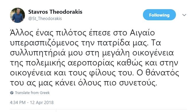 «Άλλος ένας πιλότος έπεσε στο Αιγαίο υπερασπιζόμενος την πατρίδα μας. Τα συλλυπητήριά μου στη μεγάλη οικογένεια της πολεμικής αεροπορίας καθώς και στην οικογένεια και τους φίλους του. Ο θάνατός του ας μας κάνει όλους πιο συνετούς», ήταν το σχόλιο του Επικεφαλής του Ποταμιού Σταύρου Θεοδωράκη με αφορμή την πτώση του μοιραίου Mirage στη Σκύρο.