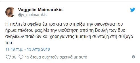 «Η Πολιτεία οφείλει έμπρακτα να στηρίξει την οικογένεια του ήρωα πιλότου μας. Με την υιοθέτηση από τη Βουλή των δυο ανήλικων παιδιών και χορηγώντας τιμητική σύνταξη στη σύζυγό του», ανέφερε στο λογαριασμό που διατηρεί στο Twitter ο πρώην πρόεδρος της Νέας Δημοκρατίας.