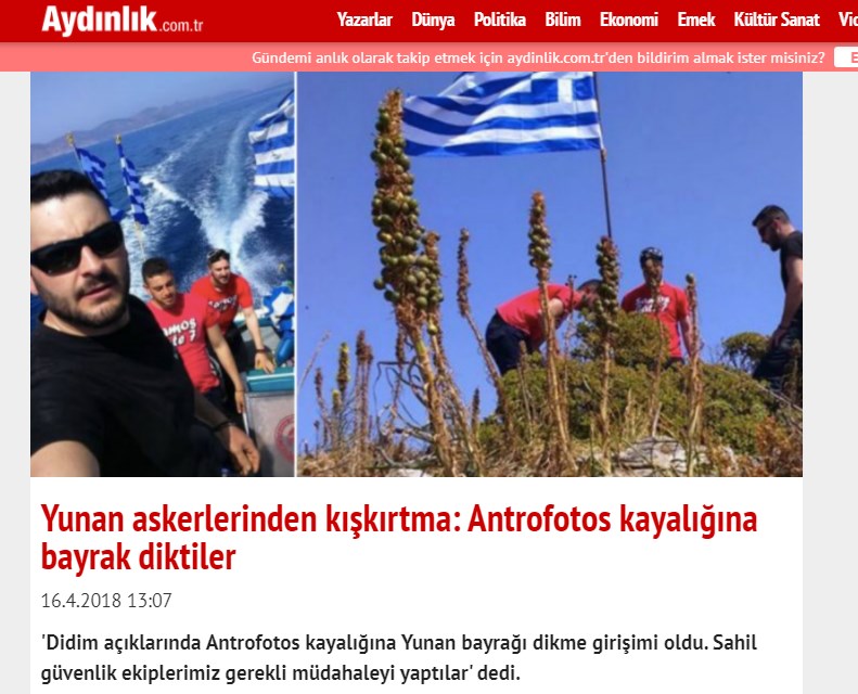 Ο ιστότοπος Aydinlik συνδέει τις δηλώσεις Γιλντιρίμ με την κίνηση τρεις νεαρών να υψώσουν την ελληνική σημαία την περασμένη Παρασκευή στη βραχονησίδα “Μικρός Ανθρωποφάγος” κοντά στους Φούρνους, και δημοσιεύει τις φωτογραφίες.