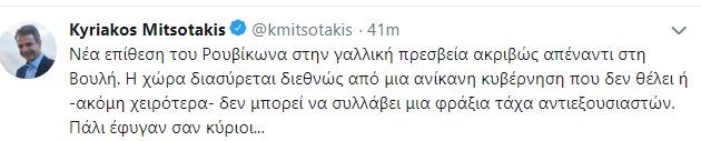 Επίθεση στην κυβέρνηση εξαπέλυσε ο πρόεδρος της Νέας Δημοκρατίας, με αφορμή την επίθεση του Ρουβίκωνα στη γαλλική πρεσβεία.