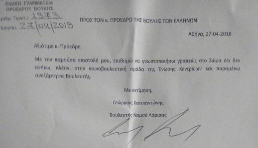 Την ανεξαρτητοποίησή του από την κοινοβουλευτική ομάδα της Ένωσης Κεντρώων ανακοίνωσε ο Γιώργος Κατσιαντώνης. Ο πολιτευτής Λάρισας θα διατηρήσει την έδρα του ως ανεξάρτητος, όπως δήλωσε ο ίδιος.