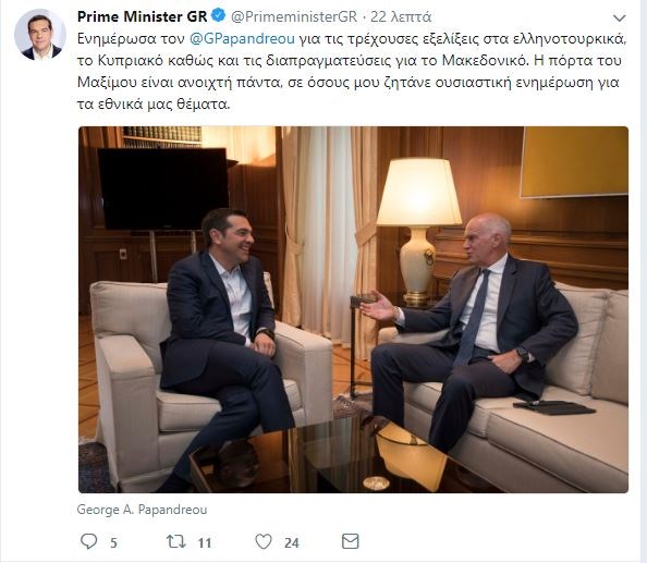 Σύμφωνα με τα αναφέρονται στον επίσημο λογαριασμό του στο Twitter, ο κ. Τσίπρας ενημέρωσε τον κ. Παπανδρέου για τις τρέχουσες εξελίξεις στα ελληνοτουρκικά, το Κυπριακό, αλλά και για τις διαπραγματεύσεις για το Σκοπιανό.