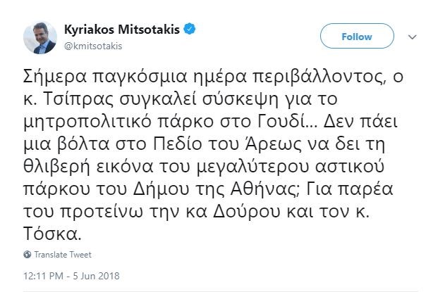 Σε ανάρτησή του στο twitter ο πρόεδρος της ΝΔ αναφέρει χαρακτηριστικά: «Σήμερα παγκόσμια μέρα περιβάλλοντος, ο κ. Τσίπρας συγκαλεί σύσκεψη για το μητροπολιτικό πάρκο στο Γουδί. Δεν πάει μια βόλτα στο Πεδίο του Άρεως να δει τη θλιβερή εικόνα του μεγαλύτερου αστικού πάρκου του Δήμου της Αθήνας; Για παρέα του προτείνω την κα Δούρου και τον κ. Τόσκα», τονίζει ο πρόεδρος της ΝΔ.