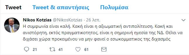 «Η συμφωνία είναι καλή. Κακή είναι η αξιωματική αντιπολίτευση. Κακή και ανιστόρητη, εκτός πραγματικότητος, είναι η σημερινή ηγεσία της ΝΔ. Θέλει να διχάσει χώρα προκειμένου να μην φανεί ο εσωκομματικός της διχασμός», έγραψε στον προσωπικό του λογαριασμό στο Twitter ο υπουργός Εξωτερικών Νίκος Κοτζιάς, λίγες ώρες μετά την ανακοίνωση από τον πρωθυπουργό Αλέξη Τσίπρα για επίτευξη συμφωνίας με τον πρωθυπουργό της ΠΓΔΜ Ζόραν Ζάεφ.