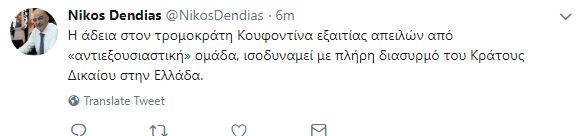 «Η άδεια στον τρομοκράτη Κουφοντίνα εξαιτίας απειλών από «αντιεξουσιαστική» ομάδα, ισοδυναμεί με πλήρη διασυρμό του Κράτους Δικαίου στην Ελλάδα», ανέφερε χαρακτηριστικά στην ανάρτησή του ο κ. Δένδιας.