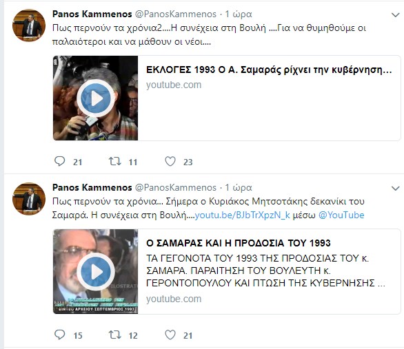 Στην πρώτη ανάρτηση αναφέρει “Πως περνούν τα χρόνια… Σήμερα ο Κυριάκος Μητσοτάκης δεκανίκι του Σαμαρά. Η συνέχεια στη Βουλή…” και πόσταρε μαζί και ένα βίντεο διάρκειας 12 λεπτών με τίτλο “Ο Σαμαράς και η προδοσία του 1993”.