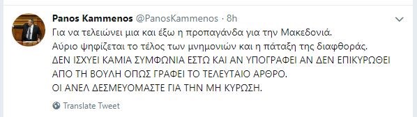 «Για να τελειώνει μια και έξω η προπαγάνδα για την Μακεδονία. Αύριο ψηφίζεται το τέλος των μνημονίων και η πάταξη της διαφθοράς» έγραψε στο twitter o υπουργός Εθνικής Άμυνας και πρόεδρος των ΑΝΕΛ, Πάνος Καμμένος. «Δεν ισχύει καμιά συμφωνία έστω και αν υπογραφεί αν δεν επικυρωθεί από τη Βουλή όπως γράφει το τελευταίο άρθρο. Οι ΑΝΕΛ δεσμευόμαστε για τη μη κύρωση» σημείωσε.