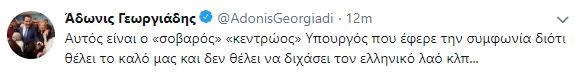 Συγκεκριμένα, απάντησε μέσω Twitter ο αντιπρόεδρος της Αξιωματικής Αντιπολίτευσης, Άδωνις Γεωργιάδης. «Αυτός είναι ο «σοβαρός» «κεντρώος» Υπουργός που έφερε τη συμφωνία διότι θέλει το καλό μας και δεν θέλει να διχάσει τον ελληνικό λαό κλπ…».