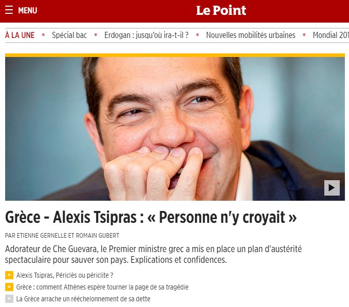 Με πρωτοσέλιδο τίτλο «Ελλάδα, η Αναγέννηση» και 32 σελίδες αφιερωμένες στην Ελλάδα, κυκλοφόρησε σήμερα το μεγάλης κυκλοφορίας περιοδικό Le Point. Επίσης, η αποκλειστική συνέντευξη του Έλληνα Πρωθυπουργού προβάλλεται στο πρωτοσέλιδο με τιτλο «Αλέξης Τσίπρας: Κανείς δεν το πίστευε».
