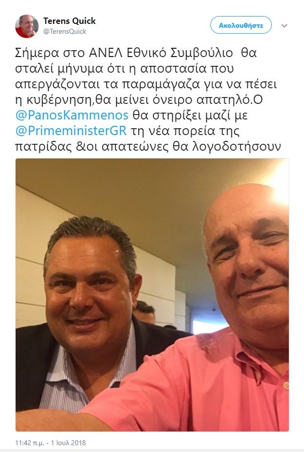 Ο υφυπουργός Εξωτερικών Τέρενς Κουίκ ανέβασε στον προσωπικό του λογαριασμό στο Twitter μία φωτογραφία του μαζί με τον Πρόεδρο των ΑΝΕΛ και υπουργό Εθνικής Άμυνας Πάνο Καμμένο.