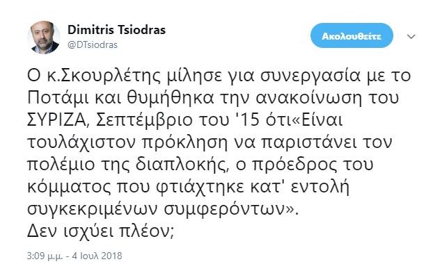Από την άλλη πλευρά έντονη ήταν η αντίδραση του εκπροσώπου Τύπου του Ποταμιού Δημήτρη Τσιόδρα στα όσα είπε ο υπουργός Εσωτερικών. «Ο κ. Σκουρλέτης μίλησε για συνεργασία με το Ποτάμι και θυμήθηκα την ανακοίνωση του ΣΥΡΙΖΑ, Σεπτέμβριο του ’15 ότι«Είναι τουλάχιστον πρόκληση να παριστάνει τον πολέμιο της διαπλοκής, ο πρόεδρος του κόμματος που φτιάχτηκε κατ’ εντολή συγκεκριμένων συμφερόντων». Δεν ισχύει πλέον;» ανέφερε χαρακτηριστικά ο κ. Τσιόδρας.
