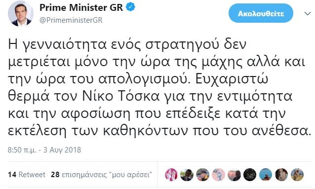“Ευχαριστώ θερμά τον Νίκο Τόσκα για την εντιμότητα και την αφοσίωση που επέδειξε κατά την εκτέλεση των καθηκόντων που του ανέθεσα”, πρόσθεσε.