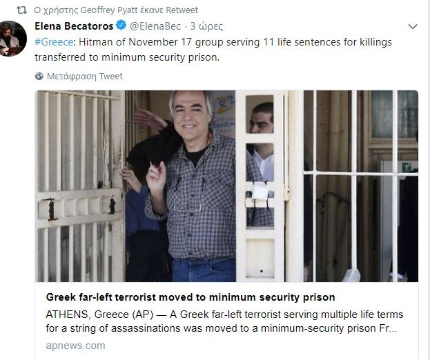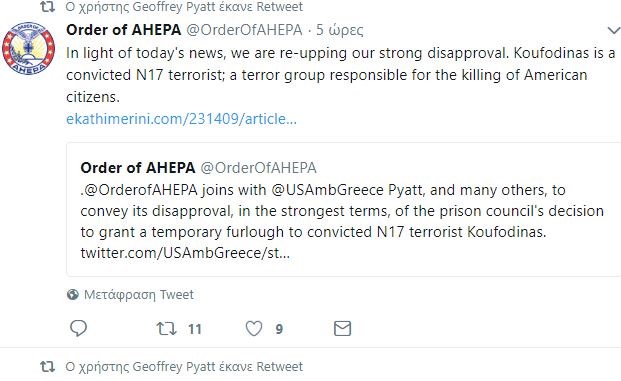 Με ανάρτησή του στο twitter, ο κ. Πάιατ καυτηριάζει τις άδειες που κατά καιρούς έχουν δοθεί στον Δημήτρη Κουφοντίνα.