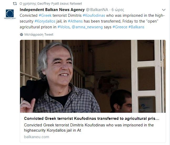 Αναδημοσιεύοντας παλαιότερα άρθρα που αφορούσαν τον Δημήτρη Κουφοντίνα θέλησε να σχολιάσει ο Αμερικανός πρεσβευτής στην Αθήνα, Τζέφρι Πάιατ τη μεταφορά του ηγετικού στελέχους της 17Ν από τις φυλακές Κορυδαλλού, στις αγροτικές φυλακές Βόλου.