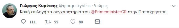Ως “κακή επιλογή” χαρακτήρισε σε tweet του ο Βουλευτής του ΣΥΡΙΖΑ Γιώργος Κυρίτσης, τα συγχαρητήρια του Πρωθυπουργού στην Βούλα Παπαχρήστου, μετά την κατάκτηση του χρυσού μεταλλίου στο τριπλούν στο Ευρωπαϊκό Πρωτάθλημα στίβου στο Βερολίνο.