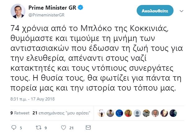Στην επέτειο των 74 ετών από το Μπλόκο της Κοκκινιάς αναφέρθηκε με ανάρτησή του στο twitter ο Πρωθυπουργός Αλέξης Τσίπρας.