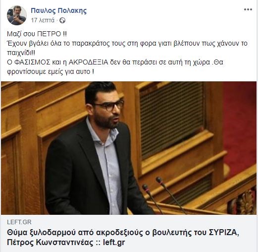 Με ανάρτησή του στο facebook o αναπληρωτής υπουργός Υγείας, Παύλος Πολάκης, εκφράζει την αμέριστη στήριξή του στον συνάδελφό του, βουλευτή ΣΥΡΙΖΑ, Πέτρο Κωνσταντινέα που έπεσε θύμα επίθεσης στην Καλαμάτα.