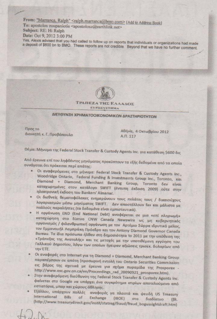 Λαβράκι φαίνεται πως έβγαλε η διατραπεζική έρευνα για το παρ’ ολίγον… σωτήριο έμβασμα των 600 δισ. δολαρίων. Τόσο η τράπεζα της Ελλάδος, όσο και η καναδική Bank of Montreal κατηγορηματικά δηλώνουν ότι ουδέποτε υπήρξε ανάλογη κατάθεση.”Τα δημοσιεύματα περί κατάθεσης 600 δισ. στην BOM (Τράπεζα του Μόντρεαλ) δεν είναι αξιόπιστα. Πέραν τούτου δεν έχουμε να προβούμε σ επεραιτέρω σχολιασμό” λένε οι Καναδοί και όπως αποδεικνύεται οι ΕΝD παρουσίασαν πλαστό έγγραφο που αναφέρει ότι ο κ. Σώρρας έχει καταθέσει το ποσό των 600 δισ. δολαρίων σε χρεώγραφα του αμερικανικού δημοσίου με ημερομηνία λήξης τον Αύγουστο του 2014.Στο ίδιο μήκος κύματος με την τράπεζα του Μόντρεαλ είναι και η Τράπεζα της Ελλάδος, που αναφέρει χαρακτηριστικά ότι τα δεδομένα που εξετάστηκαν οδηγούν στο συμπέρασμα ότι πρόκειται για απάτη.