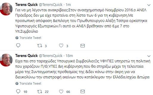 “Είχα πει στο ταραχώδες Υπουργικό Συμβούλιο: Ως ΥΦΥΠΕΞ υπηρετώ τη πολιτική που χαράζουν Πρωθυπουργός ,ΥΠΕΞ και η κυβέρνηση,που θα στηρίξω μέχρι τη τελευταία μέρα της Συνταγματικής προθεσμίας της και δεν κάνω στην άκρη για να διευκολύνω την επιστροφή εκείνων που κατέκλεψαν την Ελλάδα.Ισχύει και τώρα” έγραψε ο κ. Κουίκ στο Twitter και συνέχισε: