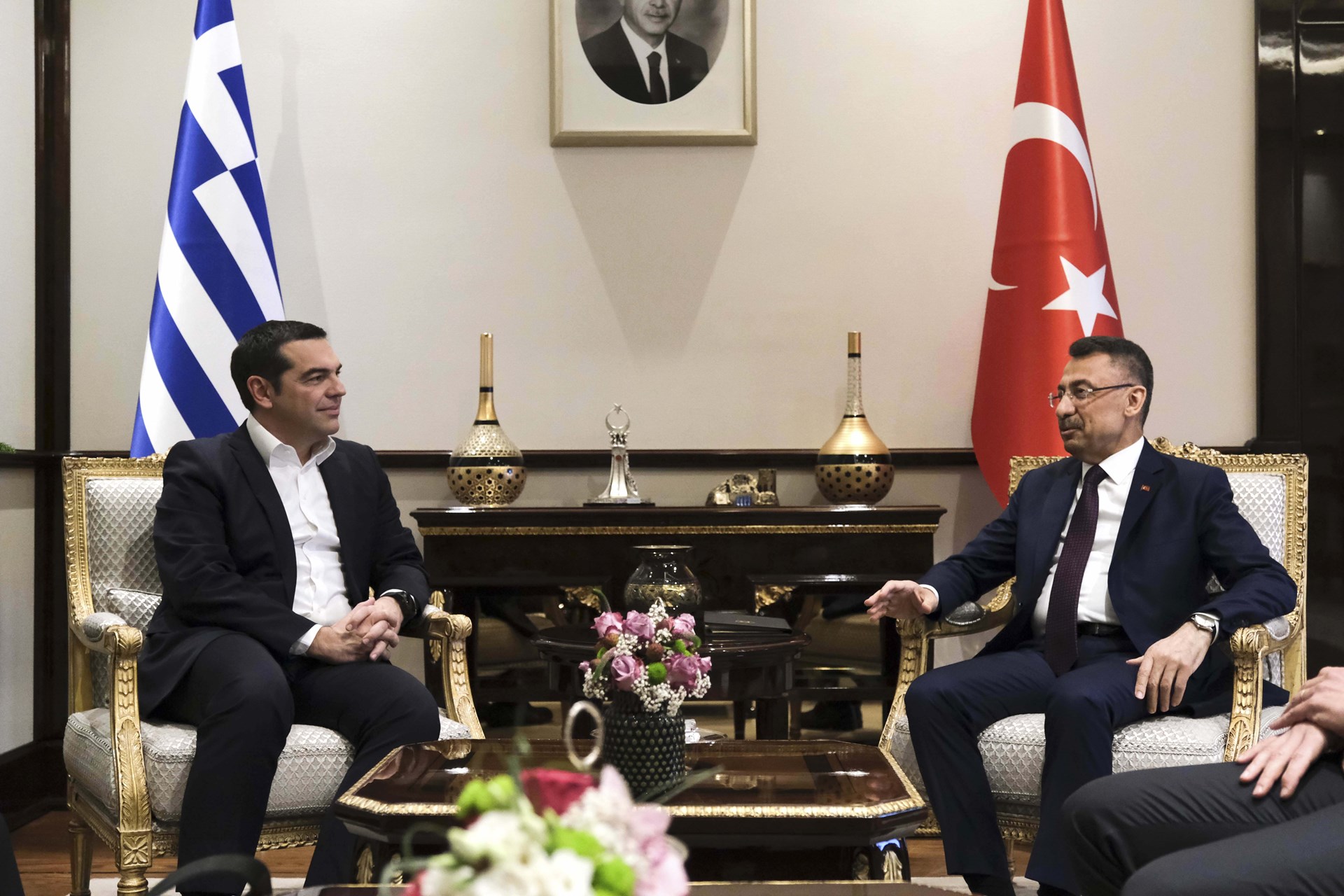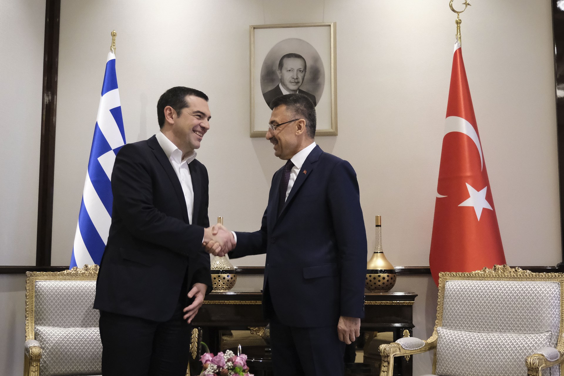 Όπως φαίνεται στις φωτογραφίες που δημοσίευσε το Anadolu τόσο ο Αλέξης Τσίπρας, όσο και ο Ταγίπ Ερντογάν εμφανίστηκαν χαμογελαστοί μπροστά στις κάμερες για τις… καθιερωμένες φωτογραφίες, πριν αποχωρήσουν οι δημοσιογράφοι και ξεκινήσει η συνομιλία των δύο ηγετών για μία σειρά από «καυτά» ζητήματα.