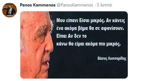 Ο πρόεδρος των Ανεξάρτητων Ελλήνων Πάνος Καμμένος έστειλε μήνυμα μέσω του προσωπικού λογαριασμού του στο twitter «ανεβάζοντας» μία φωτογραφία με μία φράση που είχε χρησιμοποιήσει στο παρελθόν ο Βάσος Λυσσαρίδης.