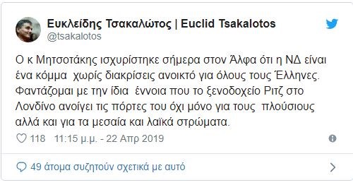 Τη συνέντευξη του Κυριάκου Μητσοτάκη στον Alpha και συγκεκριμένα τη δήλωση του προέδρου της ΝΔ ότι το κόμμα του είναι ανοιχτό, χωρίς διακρίσεις για όλους τους Έλληνες σχολίασε στο Twitter ο Ευκλείδης Τσακαλώτος.