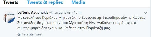 Ο Γραμματέας της ΝΔ Λευτέρης Αυγενάκης έκανε το εξής tweet: «Με εντολή του Κυριάκου Μητσοτάκη ο Συντονιστής Ετεροδημοτών κ. Κώστας Στεφανίδης διεγράφη πριν από λίγο από τη ΝΔ. Ανάλογες εκφράσεις και συμπεριφορές δεν έχουν καμία θέση στην παράταξή μας».