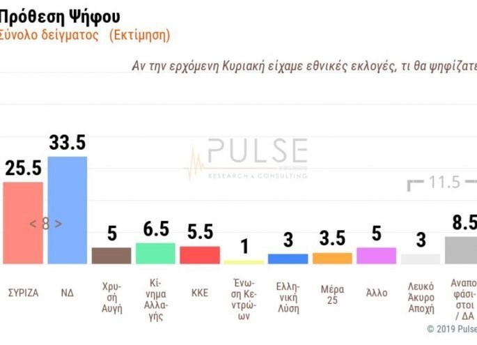 Ειδικότερα, σύμφωνα με την μέτρηση της PULSE για τον ΣΚΑΪ, στην πρόθεση ψήφου η Νέα Δημοκρατία συγκεντρώνει ποσοστό 33,5%, έναντι 25,5% του ΣΥΡΙΖΑ, δηλαδή υπάρχει διαφορά 8 ποσοστιαίων μονάδων.