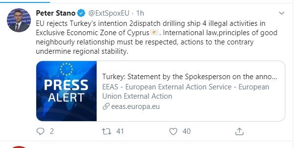“Μετά την τελευταία ανακοίνωση από τις τουρκικές Αρχές ότι το γεωτρύπανο Γιαβούζ θα αποσταλεί για νέα γεώτρηση, η ΕΕ υπενθυμίζει τη θέση της αναφορικά με τις παράνομες γεωτρήσεις της Τουρκίας στην ΑΟΖ της Κύπρου. Απαιτούνται συγκεκριμένα βήματα για τη δημιουργία περιβάλλοντος που ευνοεί τον καλό διάλογο.