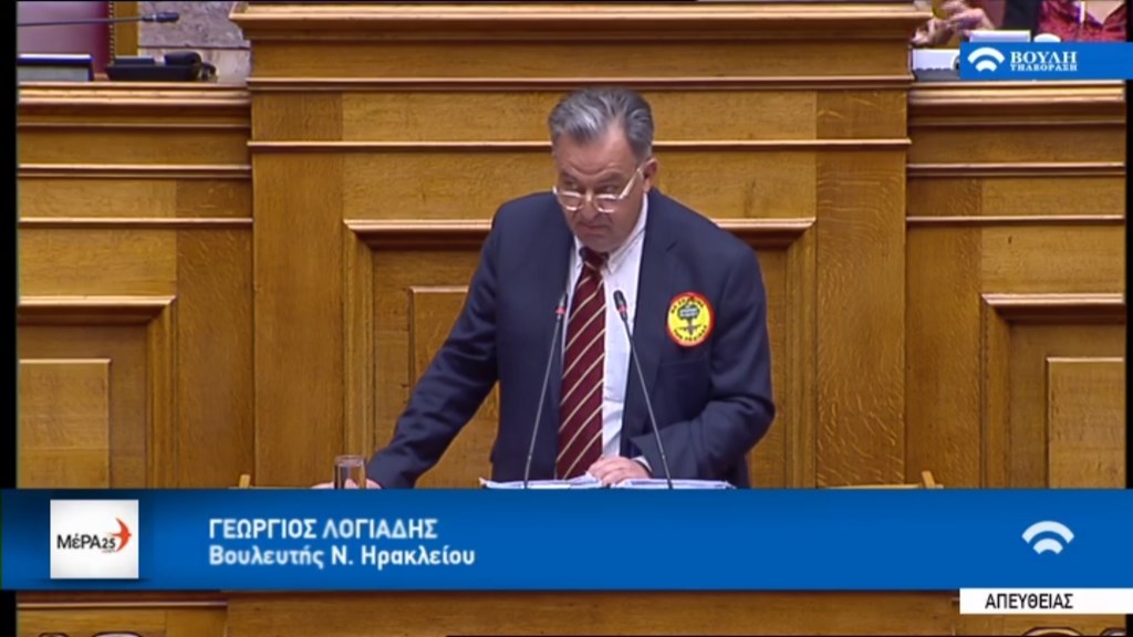 Με κονκάρδα εμφανίστηκε στην Ολομέλεια της Βουλής ο βουλευτής του ΜέΡΑ 25 Γιώργος Λογιάδης. Ο βουλευτής Ηρακλείου ανέβηκε στο βήμα για να μιλήσει και επέλεξε να εκφράσει την αντίθεσή του στη δημιουργία του νέου αεροδρομίου στο Καστέλλι Πεδιάδος στην Κρήτη, φορώντας μια σχετική κονκάρδα στο σακάκι.