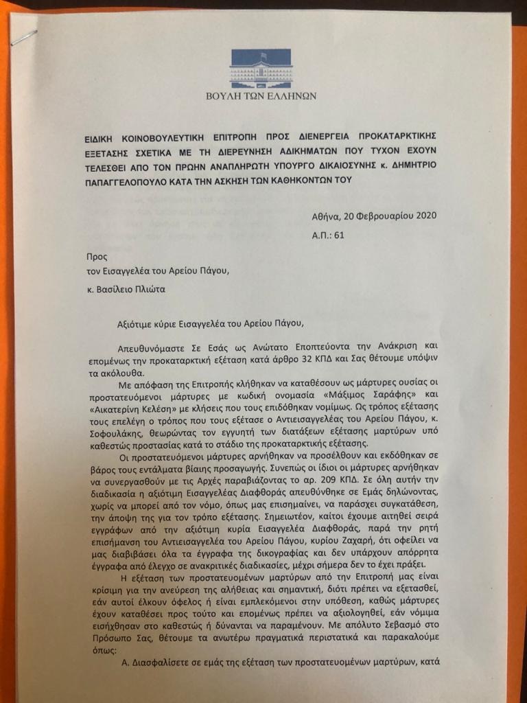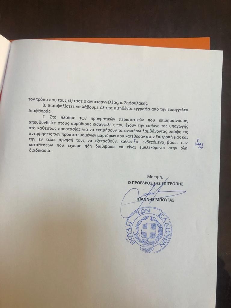 Με το έγγραφό τους τα μέλη της προανακριτικής επιτροπής ζητούν να εξεταστούν οι δύο προστατευόμενοι μάρτυρες, όπως ακριβώς εξετάστηκαν από τον αντεισαγγελέα του Αρείου Πάγου, Λάμπρο Σοφουλάκη.
