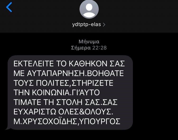Σε μαζική αποστολή sms προς τους αστυνομικούς προχώρησε την Τετάρτη το βράδυ ο υπουργός Προστασίας του Πολίτη, Μιχάλης Χρυσοχοΐδης, σε μία προσπάθεια να εμψυχώσει το προσωπικό της ΕΛ.ΑΣ. στις δράσεις για την αντιμετώπιση του κορονοϊού.