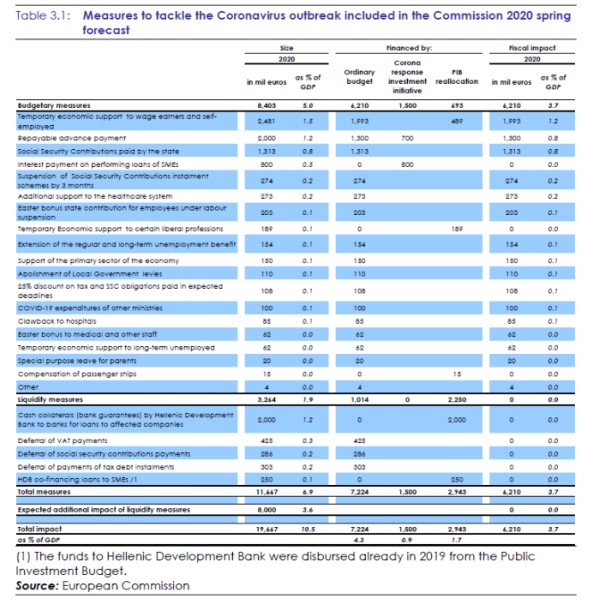 Συμπερασματικά, στις ανακοινώσεις της Κυβέρνησης περιλαμβάνονται μέτρα με κόστος 14,5 δισ. ευρώ, τα οποία έχουν ήδη προσδιοριστεί και ποσοτικοποιηθεί, καθώς και το ποσό που υπολογίζεται να μοχλεύσουν τα χρηματοδοτικά εργαλεία τα οποία χρησιμοποιούνται, ξεπερνώντας έτσι τα 20 δισ. ευρώ. Η Κυβέρνηση έχει υπολογίσει σύνολο μέτρων 24 δισ. ευρώ για το 2020, λαμβάνοντας υπόψη και όσα θα εξειδικευτούν το προσεχές διάστημα για την επόμενη φάση της ανάταξης της οικονομίας, με την αξιοποίηση επιπλέον πόρων και δαπανών από ευρωπαϊκά κονδύλια.