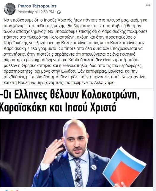Ο Πέτρος Τατσόπουλος έγραψε στην ανάρτησή του: “Να υποθέσουμε ότι ο Ιησούς Χριστός ήταν πάντοτε στο πλευρό μας, ακόμη και όταν χάναμε στο πεδίο της μάχης -θα βαριόταν τότε να παρέμβει ή θα ήταν αλλού απασχολημένος. Να υποθέσουμε επίσης ότι ο Καραϊσκάκης πολεμούσε πάντοτε στο πλευρό του Κολοκοτρώνη, ακόμη και όταν προσπαθούσε ο Καραϊσκάκης να εξοντώσει τον Κολοκοτρώνη, όπως και ο Κολοκοτρώνης τον Καραϊσκάκη. Ψιλά γράμματα. Σε τίποτε από όλα αυτά δεν υποχρεώνεσαι να απαντήσεις, όταν πιστεύεις ακράδαντα ότι απευθύνεσαι σε ένα εκλογικό ακροατήριο με νοημοσύνη νηπίου. Καμία δουλειά δεν είναι ντροπή -πόσω μάλλον η Θρησκοκαπηλία και η Εθνοκαπηλία, δύο από τις πιο κερδοφόρες δραστηριότητες, όχι μόνο στην Ελλάδα. Εάν καταφέρεις, μάλιστα, και την συνδυάσεις με τη Φαιδρότητα, δεν πρόκειται να πεινάσεις ποτέ, Κωνσταντίνε· και στη Βουλή να μην ξαναμπείς, σε περιμένει το Δελφινάριο”.