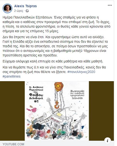 Ο κ. Τσίπρας εύχεται «ολόψυχα καλή επιτυχία σε κάθε μαθήτρια και κάθε μαθητή», καλώντας τους να θυμούνται «πως ό,τι και να γίνει στις Πανελλαδικές, κανείς δεν θα σας στερήσει τη ζωή που θέλετε να ζήσετε». Συνοδεύει δε την ανάρτηση του με το τραγούδι «Ο προορισμός» του Φοίβου Δεληβοριά.