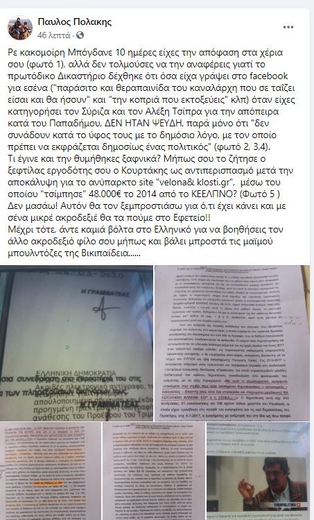 Την αντίδραση του Παύλου Πολάκη προκάλεσε η ανάρτηση του Κωνσταντίνου Μπογδάνου, σύμφωνα με την οποία το Πολυμελές Πρωτοδικείο της Αθήνας έκρινε ένοχο τον πρώην αναπληρωτή υπουργό Υγείας για το αδίκημα της προσβολής προσωπικότητας κάνοντας δεκτή την αγωγή του βουλευτή της ΝΔ.