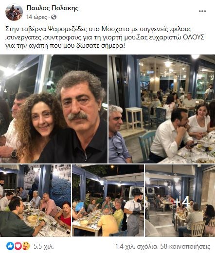 Παρέα με συγγενείς, φίλους και συνεργάτες πέρασε την ονομαστική του εορτή ο Παύλος Πολάκης, το βράδυ της Δευτέρας.