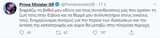 “Εκφράζω τη βαθιά μου οδύνη για τους συνανθρώπους μας που έχασαν τη ζωή τους στην Εύβοια και τα θερμά μου συλλυπητήρια στους οικείους τους. Ενημερώνομαι συνεχώς για την πορεία των διασώσεων και την έκταση της καταστροφής και αύριο θα μεταβώ στην πληγείσα περιοχή”, έγραψε ο Πρωθυπουργός στα social media.