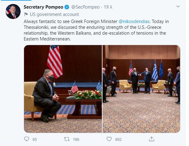 «Είναι πάντα υπέροχο να βλέπω τον Έλληνα υπουργό Εξωτερικών, Νίκο Δένδια. Σήμερα, στη Θεσσαλονίκη, συζητήσαμε για τη μακρόχρονη ισχύ των σχέσεων Ηνωμένων Πολιτειών-Ελλάδας, τα Δυτικά Βαλκάνια και την αποκλιμάκωση της έντασης στην Ανατολική Μεσόγειο», αναφέρει ο κ. Πομπέο στον λογαριασμό του στο twitter.