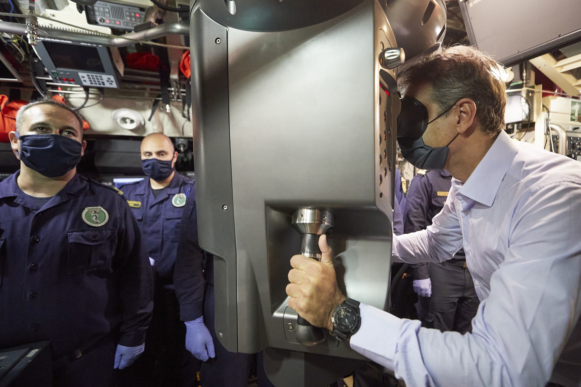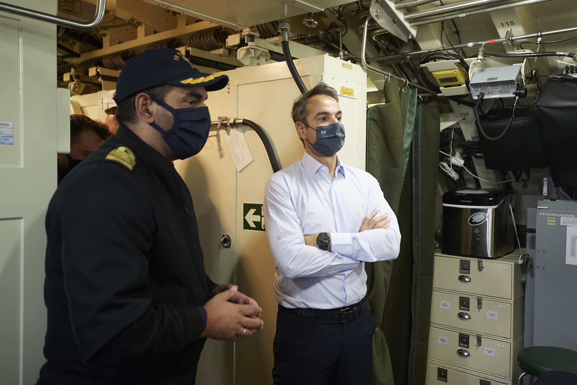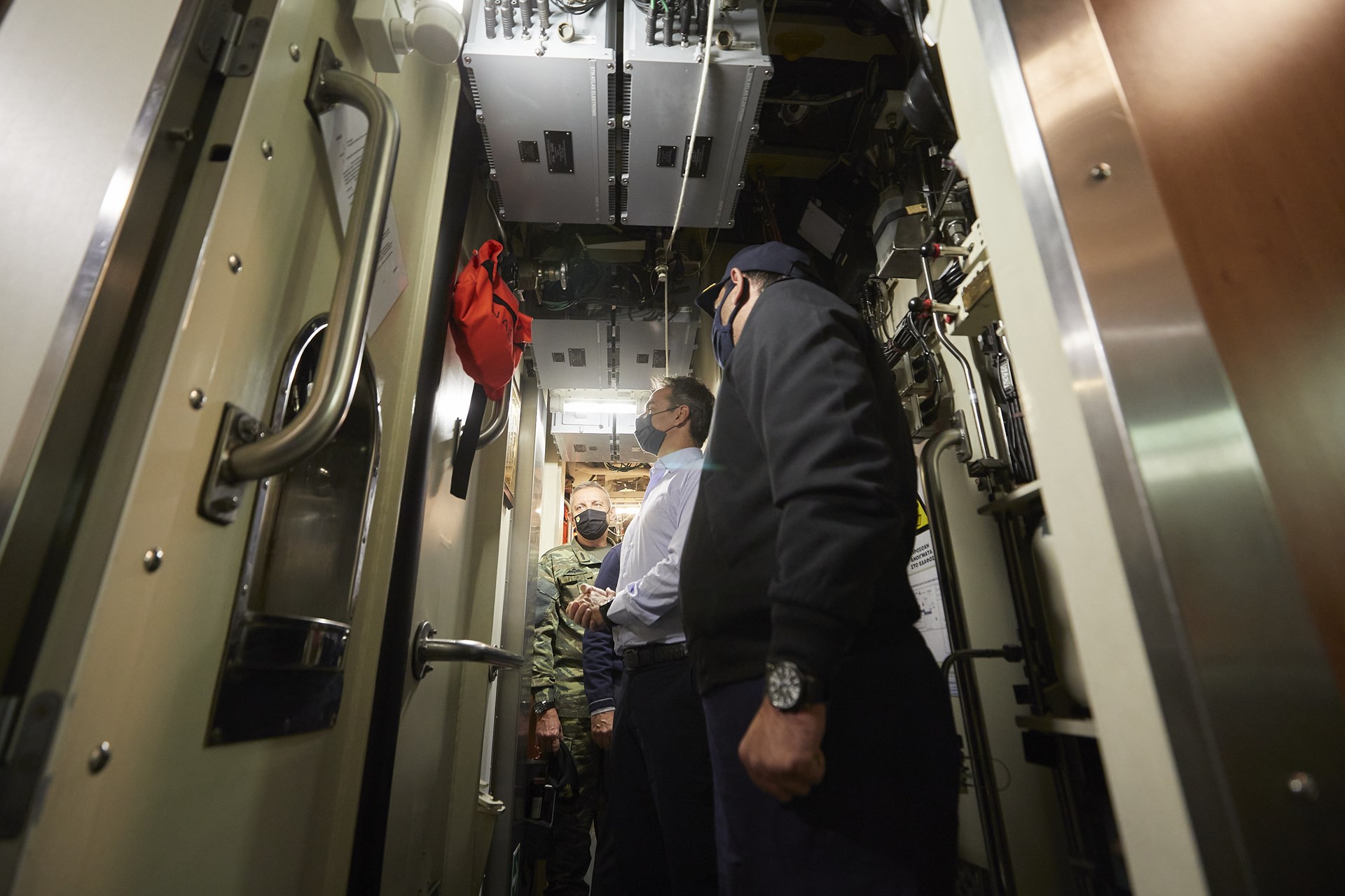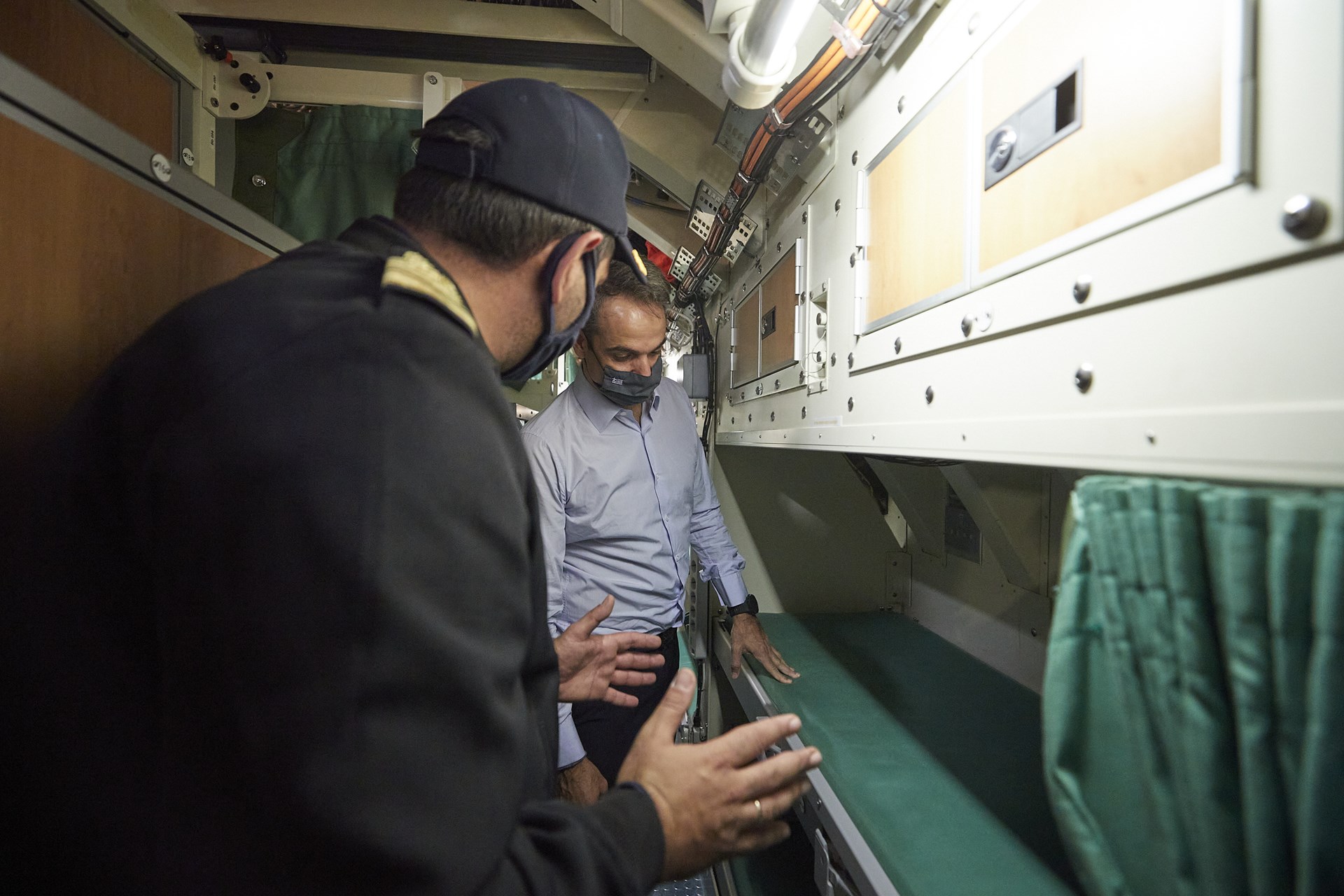 Ο κ. Μητσοτάκης συζήτησε με το προσωπικό του υποβρυχίου που αποτελείται από 36 άτομα στο σύνολό τους, αξιωματικοί, υπαξιωματικοί και Επαγγελματίες Οπλίτες.«Ήθελα και πιστεύω ότι διερμηνεύω τα αισθήματα ολόκληρου του Ελληνικού λαού, αυτή τη σημαντική μέρα που γιορτάζουμε το Έπος της Αλβανίας να σας πω ένα μεγάλο ευχαριστώ. Να σας πω πόσο υπερήφανοι είμαστε για τη δουλειά που κάνετε, να συγχαρώ ακόμα μία φορά τον Υπουργό, τον Αρχηγό των Ενόπλων Δυνάμεων, διότι οι Ένοπλες Δυνάμεις αποδεικνύουν κάθε μέρα ότι διαφυλάσσουν στο ακέραιο την εθνική κυριαρχία, μας δίνουν τη δυνατότητα μέσα από την ισχυρή αποτρεπτική τους δυνατότητα να διαβούμε τον δύσκολο δρόμο της διπλωματίας. Θέλω και πάλι να σας πω ένα μεγάλο ευχαριστώ, έμαθα πάρα πολλά πράγματα σήμερα για τις επιχειρησιακές δυνατότητες των υποβρυχίων μας», κατέληξε ο Πρωθυπουργός.