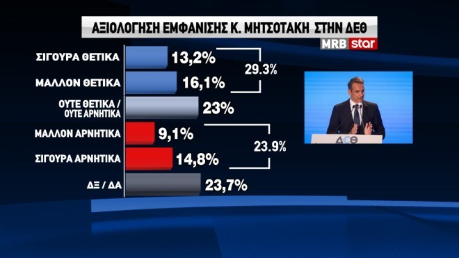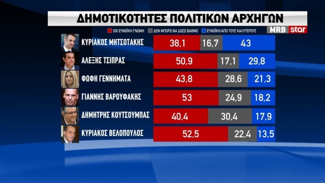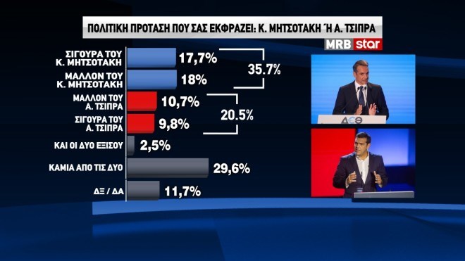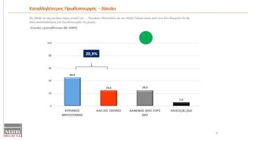 Καταλληλότερος πρωθυπουργός στο δίπολο Μητσοτάκη – Τσίπρα αναδεικνύεται στη δημοσκόπηση της MRB o Κυριάκος Μητσοτάκης με διαφορά 20, 3% (44,9% έναντι 24,6%).