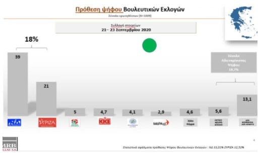Διψήφια διαφορά διατηρεί η ΝΔ από τον ΣΥΡΙΖΑ στην πρόθεση ψήφου σύμφωνα με δημοσκόπηση της MRB για λογαριασμό του Star που διεξήχθη τηλεφωνικά το διάστημα 21-23/9 σε πανελλαδικό δείγμα 1.009 ατόμων. Συγκεκριμένα, το κυβερνών κόμμα συγκεντρώνει 39% έναντι 21% του ΣΥΡΙΖΑ, ενώ στην 3η θέση με 5% βρίσκεται το ΚΙΝΑΛ. Στο 4,7% κυμαίνεται το ποσοστό του ΚΚΕ, στο 4,1% είναι η Ελληνική Λύση, ενώ κάτω του 3% είναι το MέΡΑ25 ΤΟΥ Γιάννη Βαρουφάκη (2,9%). Το «άλλο κόμμα» είναι στο 4,6%, το «λευκό-άκυρο-αποχή» είναι στο 5,6% και το «δεν αποφάσισα-δεν απαντώ» είναι στο 13,1%.