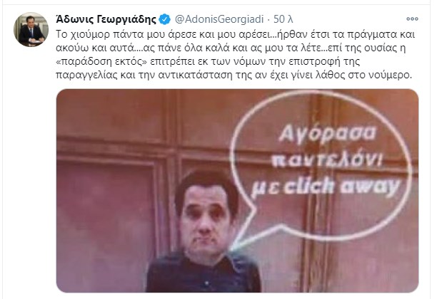 Ο υπουργός Ανάπτυξης και Επενδύσεων και αντιπρόεδρος της ΝΔ, Άδωνις Γεωργιάδης, αναδημοσίευσε ένα χιουμοριστικό meme, το οποίο κάνει τον γύρο του διαδικτύου, με θέμα το click away και πρωταγωνιστή τον ίδιο και ένα… κοντό παντελόνι.