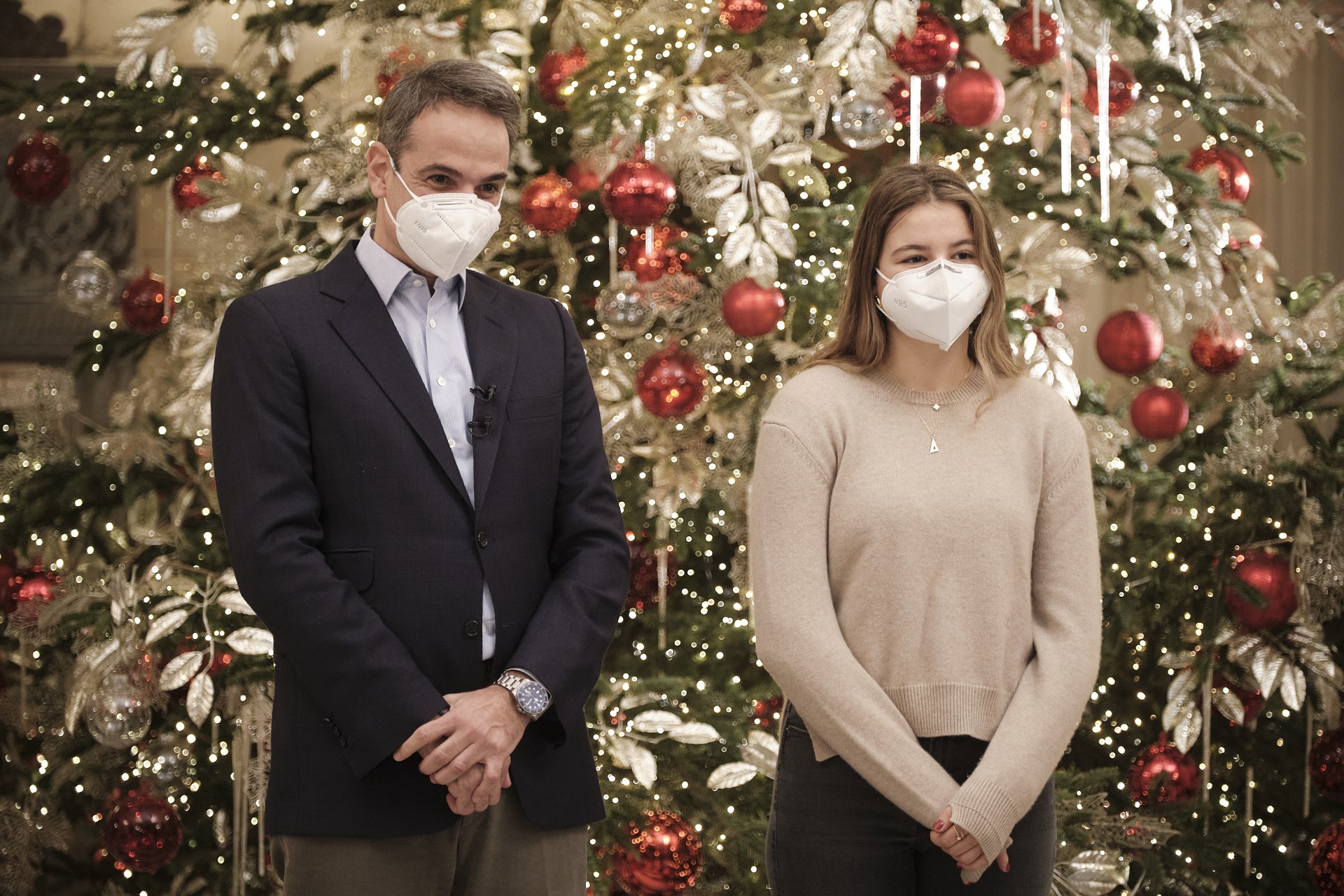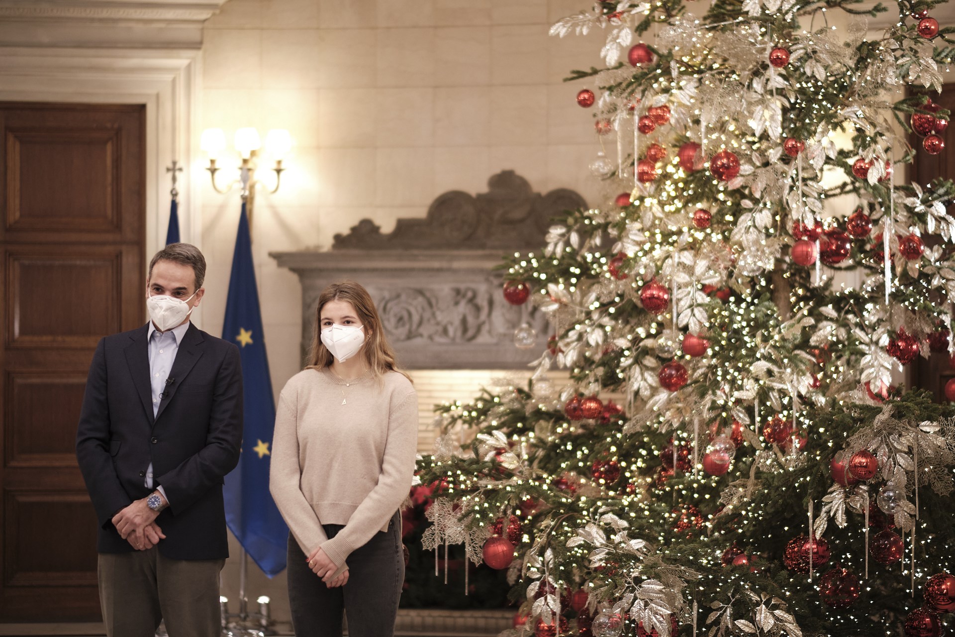 Στη συνέχεια, ο κ. Μητσοτάκης και η κόρη του, Δάφνη, άκουσαν τα κάλαντα από την Ιφιγένεια, τον Γιώργο και τον Παναγιώτη από τα Άγραφα της Ευρυτανίας. «Είμαι εδώ με την κόρη μου, τη Δάφνη, η οποία είχε βρεθεί στο όμορφο χωριό σας πέρυσι τον Ιούλιο. Και εύχομαι με το καλό να τελειώνουμε γρήγορα με τον κορονοϊό για να μπορέσω να έρθω και εγώ να σας επισκεφτώ», ανέφερε ο Κυριάκος Μητσοτάκης ευχαριστώντας τα παιδιά των Αγράφων.