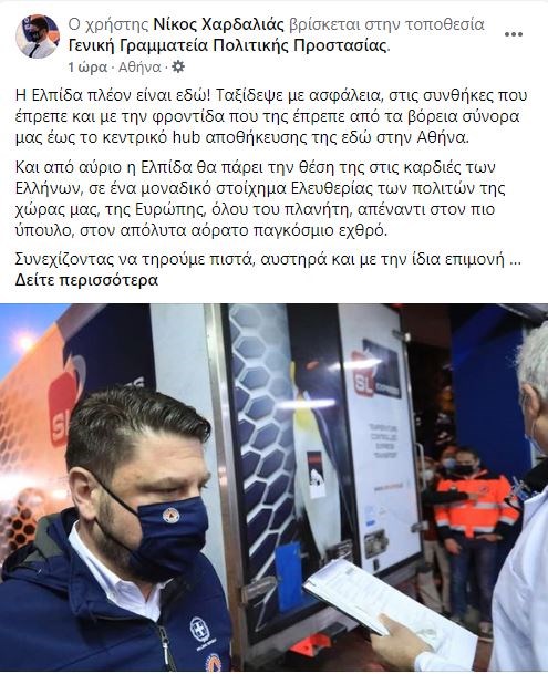 «Η Ελπίδα πλέον είναι εδώ! Ταξίδεψε με ασφάλεια, στις συνθήκες που έπρεπε και με την φροντίδα που της έπρεπε από τα βόρεια σύνορά μας έως το κεντρικό hub αποθήκευσής της εδώ στην Αθήνα. Και από αύριο η Ελπίδα θα πάρει τη θέση της στις καρδιές των Ελλήνων, σε ένα μοναδικό στοίχημα Ελευθερίας των πολιτών της χώρας μας, της Ευρώπης, όλου του πλανήτη, απέναντι στον πιο ύπουλο, στον απόλυτα αόρατο παγκόσμιο εχθρό.