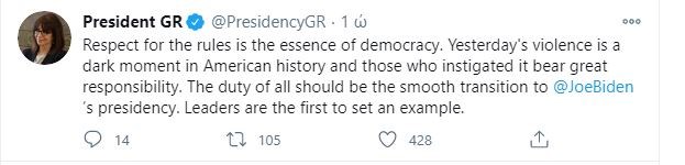 Με ανάρτησή της στο twitter, η κ. Σακελλαροπούλου αναφέρεται στην ευθύνη που φέρουν όσοι υποκίνησαν τα χθεσινά γεγονότα και τονίζει την ανάγκη για ομαλή μετάβαση της Προεδρίας στον Τζο Μπάιντεν. Μάλιστα, επισημαίνει ότι οι ηγέτες είναι οι πρώτοι που δίνουν το παράδειγμα.
