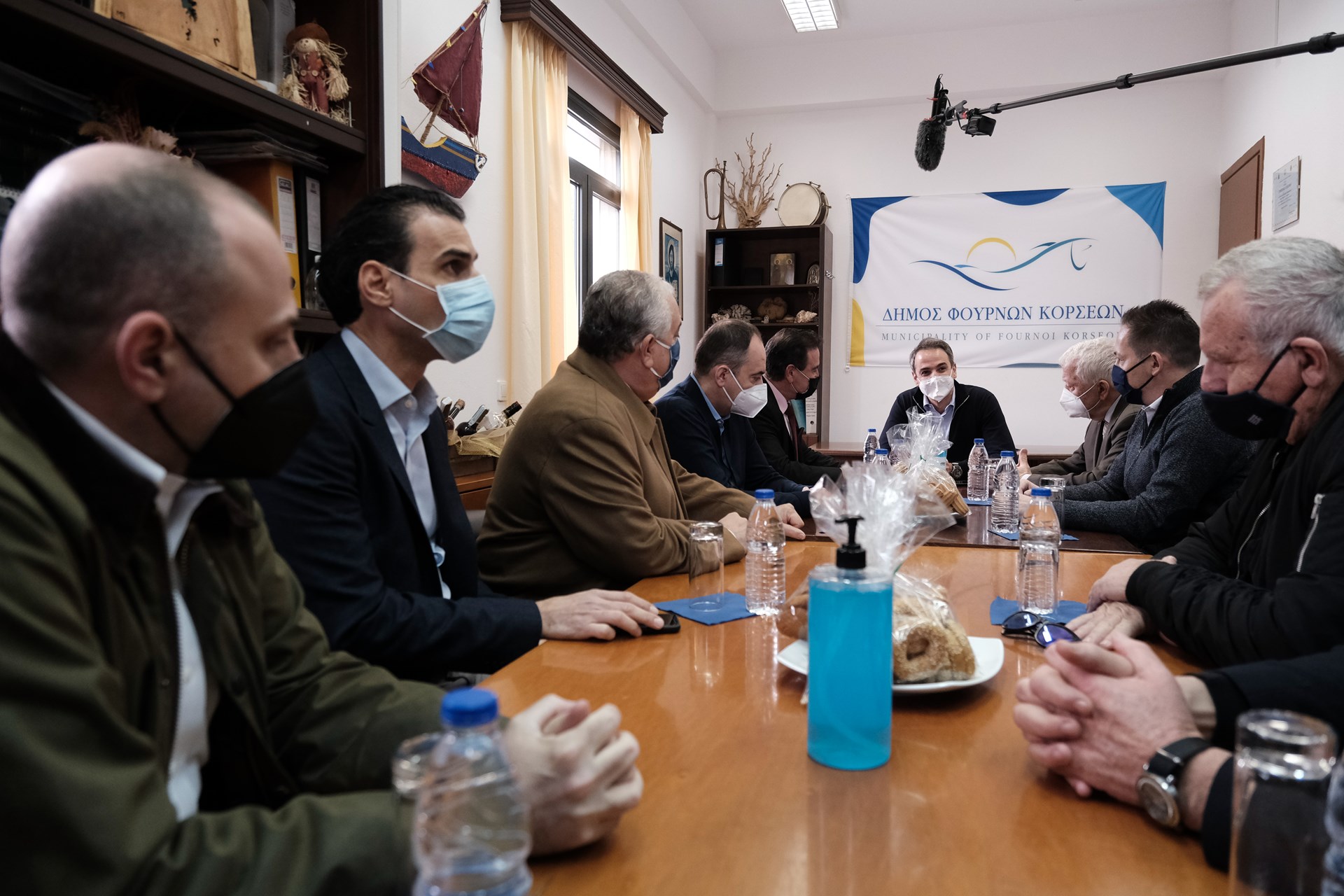 Κυβερνητικές πηγές αναφέρουν ότι ο Πρωθυπουργός είχε συνομιλία με τους κατοίκους και στη συνέχεια μετέβη στο Διοικητήριο Φούρνων Κορσεών, όπου συναντήθηκε με τον δήμαρχο Καρύδη, τον αντιδήμαρχο Οικονομικών Υπηρεσιών Δημήτρη Αμοργιανό, τον αντιδήμαρχο Εποπτείας και ευθύνης όλων των υπηρεσιών Νίκο Μελά και τον αντιδήμαρχο Αλιείας και διαχείρισης των Ευρωπαϊκών Προγραμμάτων Παναγιώτη Μύτικα.