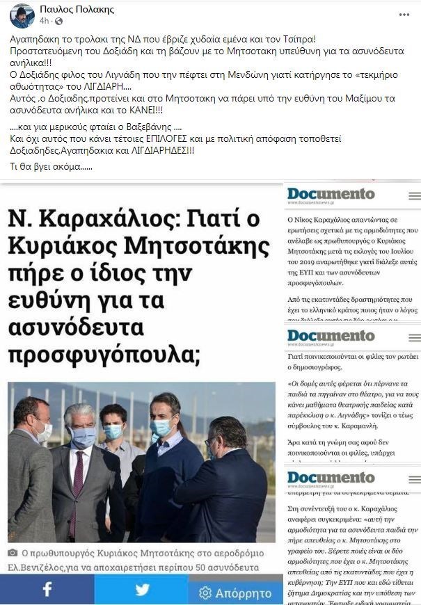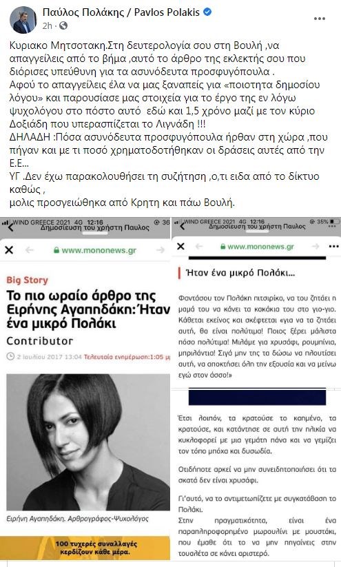 Υπενθυμίζεται ότι το πρωί της Πέμπτης ο Πάυλος Πολάκης είχε γράψει: “Τίποτα απολύτως δεν κάνατε για τα ασυνόδευτα ανήλικα!!!! Ούτε εσύ Δοξιάδη ούτε το ανίκανο τρολάκι η Αγαπηδάκη!!! ΤΙΠΟΤΑ ΑΠΟΛΥΤΩΣ!!Απαντήστε σε αυτό που έγραψα και αφήστε τον υποκριτικό αποτροπιασμό και καλά για τα χάσταγκ !!! ΓΙΑΤΙ Ο ΚΥΡΙΑΚΟΣ ΜΗΤΣΟΤΑΚΗΣ ΕΚΤΟΣ ΑΠΟ ΤΗΝ ΕΥΠ ΑΝΕΛΑΒΕ ΤΗΝ ΕΥΘΥΝΗ ΓΙΑ ΤΑ ΑΣΥΝΟΔΕΥΤΑ ΑΝΗΛΙΚΑ;;;;;; Ήξερε τι συμβαίνει;; Δοξιάδη 1,5 χρόνο τώρα είστε απλά ένα στρογγυλό μηδενικό και εσύ και η «ψυχολόγα» η Αγαπηδάκη!!! Εγώ ζητάω να μπει ΕΙΣΑΓΓΕΛΕΑΣ και να ΕΛΕΓΞΕΙ ποσά ασυνόδευτα μπήκαν εδώ και 1,5 χρόνο και ΠΟΥ ΠΗΓΑΝ!! Εσύ και η Αγαπηδάκη το ΔΕΧΕΣΤΕ;;; Άντε Ψεύτες και υποκριτές!!! ΥΓ η δεύτερη φωτο αφορά και εσάς και τον Κούγια!!!”.