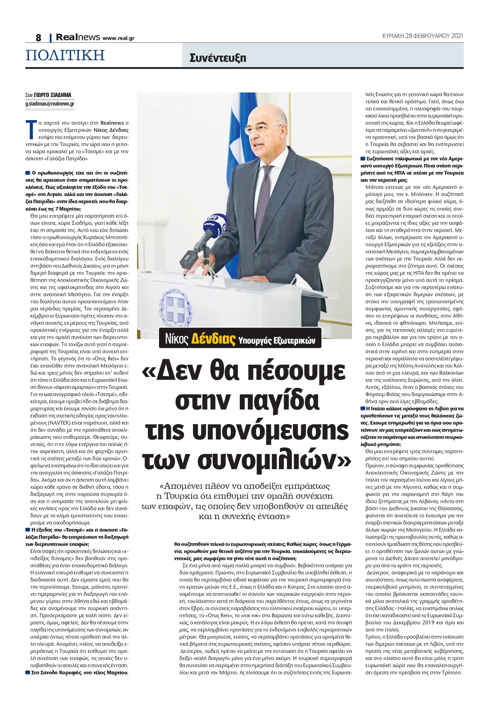 Θα μου επιτρέψετε μία παρατήρηση επί όσων είπατε, κύριε Σιαδήμα, γιατί κάθε λέξη έχει τη σημασία της. Αυτό που είχε δηλώσει τόσο ο Πρωθυπουργός Κυριάκος Μητσοτάκης όσο και εγώ ήταν ότι η Ελλάδα εξακολουθεί να διάκειται θετικά στο ενδεχόμενο ενός εποικοδομητικού διαλόγου. Ενός διαλόγου στη βάση του Διεθνούς Δικαίου, για τη μόνη διμερή διαφορά με την Τουρκία: την οριοθέτηση της Αποκλειστικής Οικονομικής Ζώνης και της υφαλοκρηπίδας στο Αιγαίο και στην ανατολική Μεσόγειο. Για την έναρξη του διαλόγου αυτού προαπαιτούμενο ήταν μια περίοδος ηρεμίας. Τον περασμένο Δεκέμβριο οι Ευρωπαίοι ηγέτες τόνισαν την ανάγκη αποχής, εκ μέρους της Τουρκίας, από προκλητικές ενέργειες για την έναρξη αλλά και για την ομαλή συνέχιση των διερευνητικών επαφών. Το τονίζω αυτό γιατί η συμπεριφορά της Τουρκίας είναι υπό συνεχή επιτήρηση. Το γεγονός ότι το «Oruç Reis» δεν έχει επανέλθει στην ανατολική Μεσόγειο εδώ και τρεις μήνες δεν σημαίνει επ’ ουδενί ότι τόσο η Ελλάδα όσο και η Ευρωπαϊκή Ένωση δίνουν «άφεση αμαρτιών» στην Τουρκία. Για το ωκεανογραφικό πλοίο «Τσεσμέ», ειδικότερα, έχουμε προβεί ήδη σε διάβημα διαμαρτυρίας και έχουμε τονίσει όχι μόνο ότι η έκδοση της σχετικής οδηγίας προς ναυτιλλομένους (NAVTEX) είναι παράτυπη, αλλά και ότι δεν συνάδει με την προσπάθεια αποκλιμάκωσης που επιθυμούμε. Θεωρούμε, συνεπώς, ότι η εν λόγω ενέργεια όχι απλώς ήταν αχρείαστη, αλλά και ότι φορτίζει αρνητικά τις σχέσεις μεταξύ των δύο κρατών. Οφείλω να επισημάνω ότι το ίδιο ισχύει και για την αναγγελία της άσκησης «Γαλάζια Πατρίδα». Ακόμα και αν η άσκηση αυτή λαμβάνει χώρα κάθε χρόνο σε διεθνή ύδατα, τόσο η διεξαγωγή της στην παρούσα συγκυρία όσο και η ονομασία της αποτελούν μη φιλικές κινήσεις προς την Ελλάδα και δεν συνάδουν με το κλίμα εμπιστοσύνης που επιχειρούμε να οικοδομήσουμε.